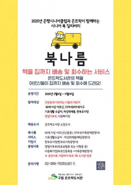 책을 품은, 열린 지식·문화공간’ 구립 은뜨락도서관(관장 김명수)이 책을 집까지 배달하는 ‘북나름’(시니어 북 딜리버리) 서비스를 운영한다고 밝혔다. 북나름은 어르신들이 도서관의 책을 집까지 배송 및 회수해 주는 서비스로 은평시니어클럽과 협력해 시행한다.